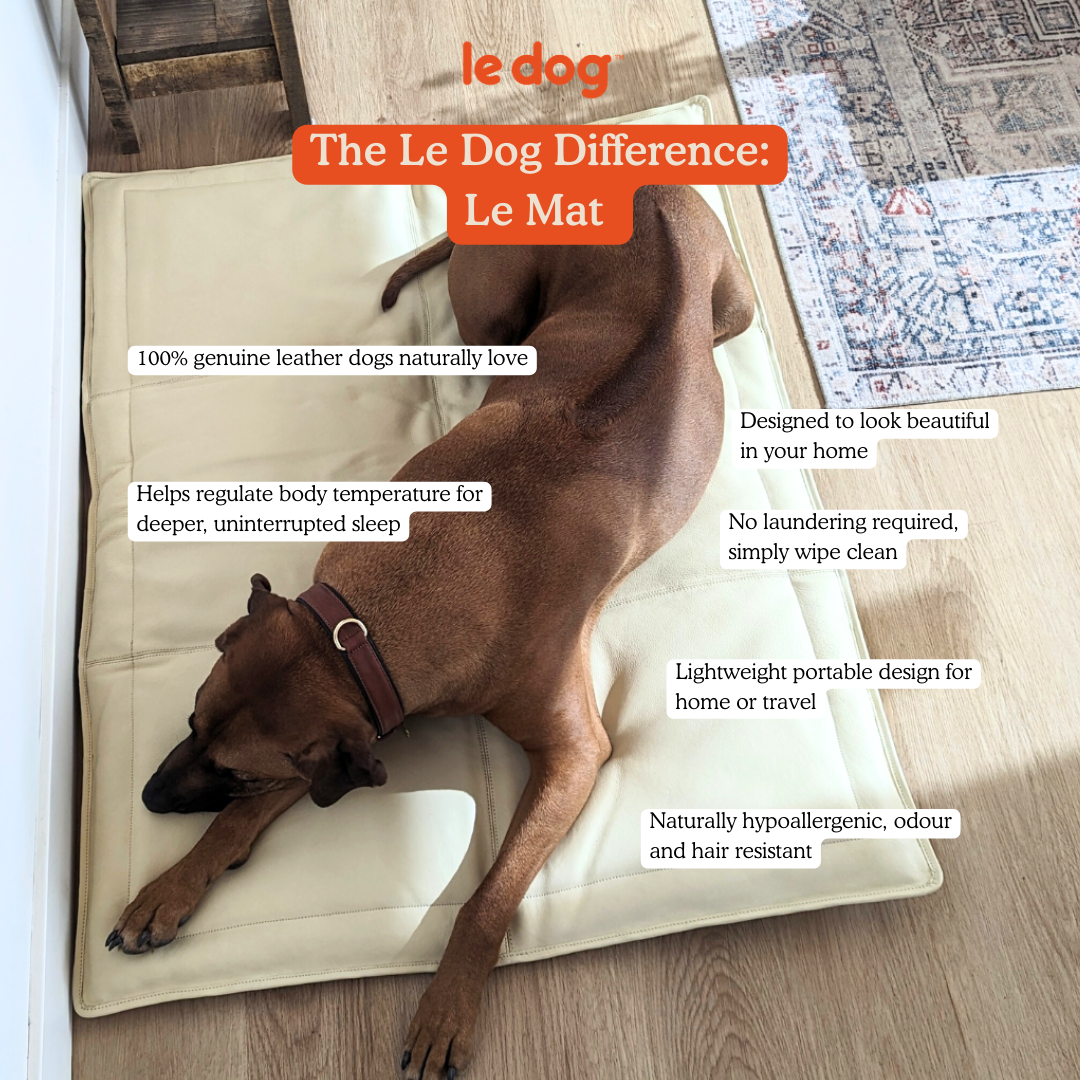 The best place for your dog to rest and relax during the day is Le Mat. A leather dog bed that's durable, easy to clean and looks great in your home. With built-in cushioning, Le Mat requires zero laundering and is designed to be portable. It's perfect for travelling, putting in the back of your vehicle and moving around your home from room to room.